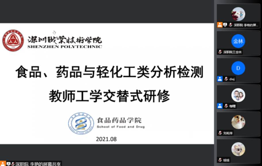8 月 10 日上午,由买球官方网站承办的2021年高职食品、药品与轻化工类分析检测教师工学交替式研修班(国培)通过腾讯会议举行“云端”开班仪式。买球官方网站院长刘冬、副院长李永红,食品专业群原群主任刘莉萍,项目负责人王金林,班主任李艳、彭嘉玲出席开班典礼。来自广东省各高职院校近30名一线骨干教师参加了此次培训。开班典礼由李永红主持。