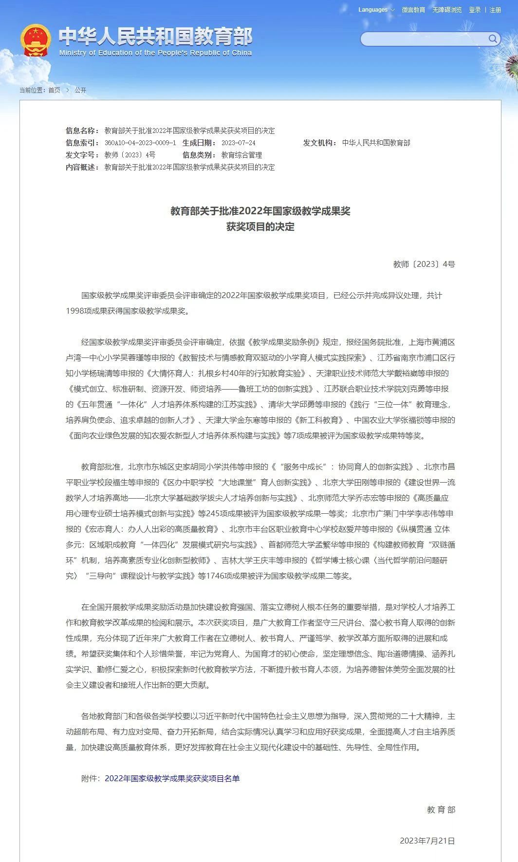国家级教学成果奖是教育教学领域的最高奖项,是与国家自然科学三大奖(国家自然科学奖、国家技术发明奖、国家科技进步奖)比肩的国家级奖励,是我国教育领域中唯一的一项国家级奖励。包含基础教育、职业教育和高等教育领域,每4年评审一次,用于奖励反映教育教学规律,具有独创性、新颖性、实用性,对提高教学水平和教育质量产生明显效果的集体和个人,其评选时间长、标准高、难度大,备受教育界关注,获奖项目需在教育教学理论及实践中取得重大突破,代表了我国教育教学工作的最高水平。(买球官方网站 冯金军)