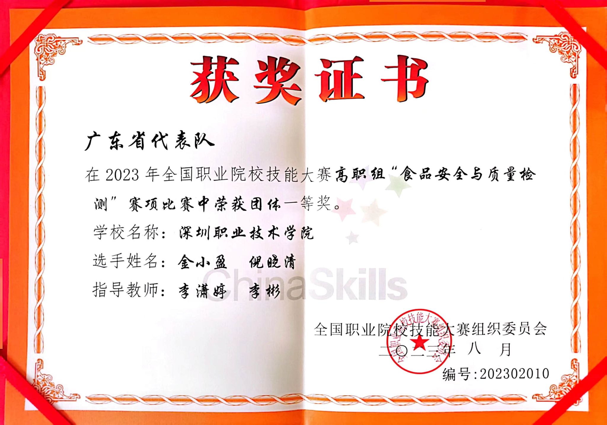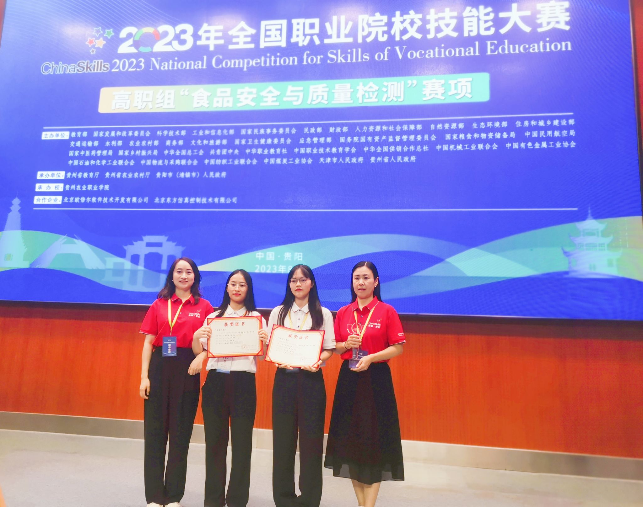 8月16日-20日,2023年全国职业院校技能大赛高职组“食品安全与质量检测”赛项在贵州农业职业学院举行,来自全国31个省(区、市)职业院校的60支队伍同台竞技。经过激励角逐,买球官网买球官方网站李潇婷、李彬、沈丽老师指导的学生倪晓清和金小盈凭借扎实的专业知识、娴熟的技能,沉着应战,团结协作,一路破关斩将,最终获得赛项团体一等奖。