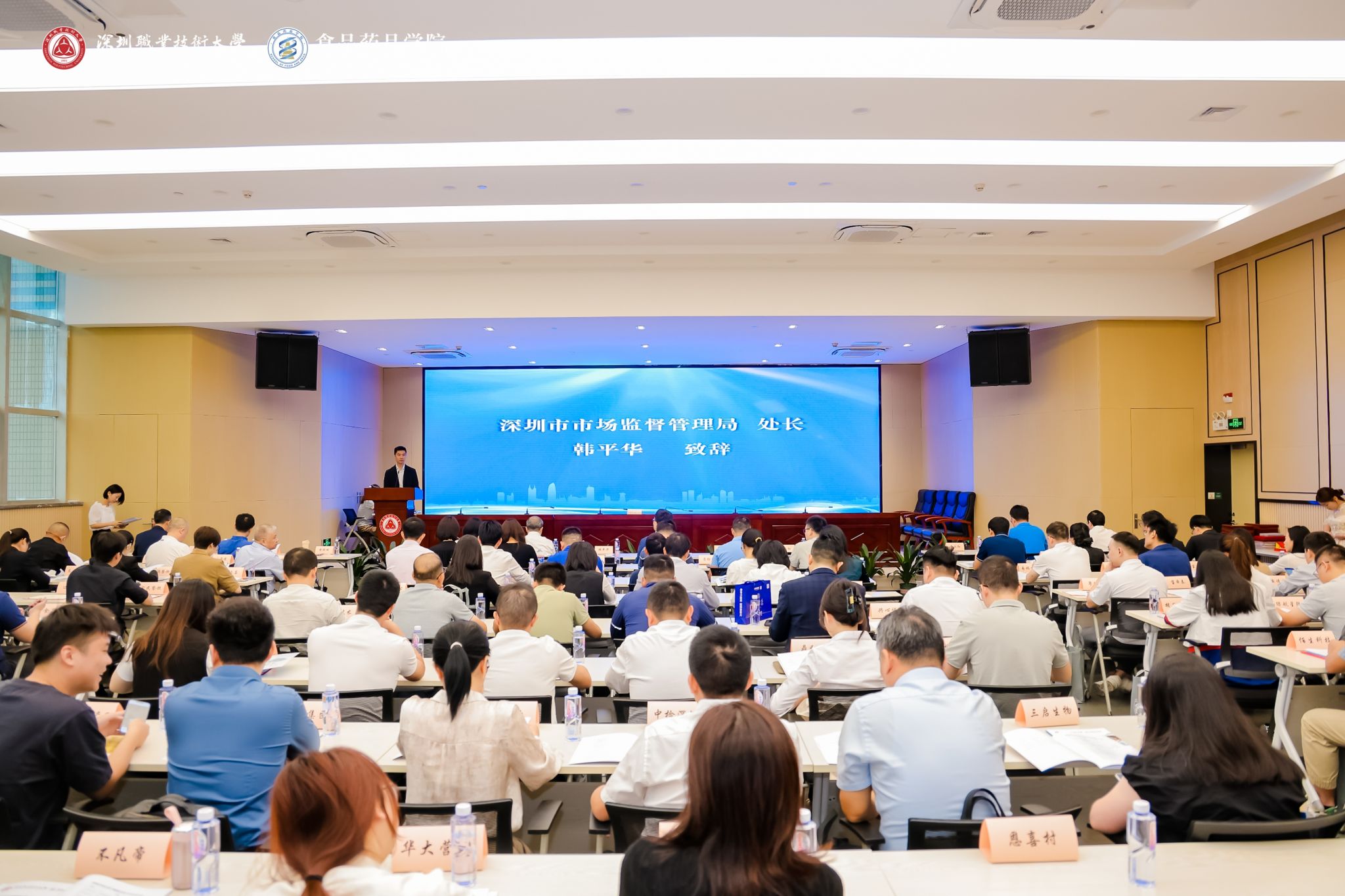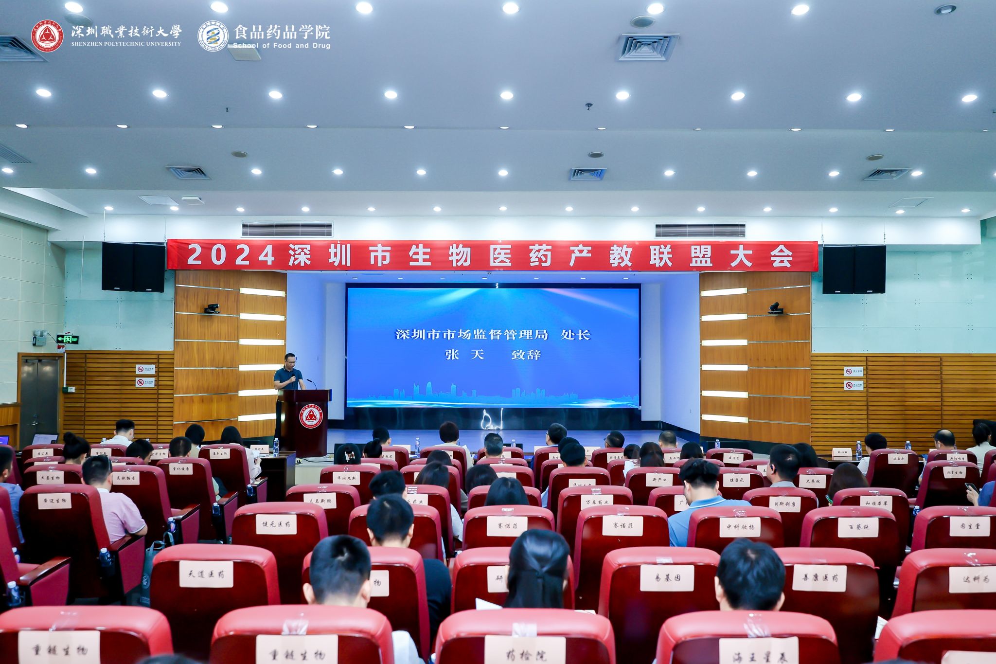 深圳市市场监督管理局食品经营安全监管处处长韩平华、药品安全监管处处长张天,买球官网副校长张作泰,买球官方网站党委书记、院长刘冬等出席会议,深圳市食品、生物医药类相关行业协会(学会)以及领军企业、头部企业、专精特新企业等近200家企业270余人参加本次年会。会议分别由买球官方网站副院长黄略略、本科教育学院制药工程技术专业主任张丽君主持。