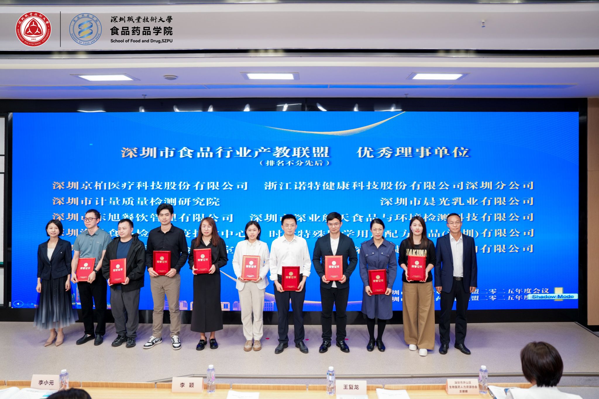 年会还举行了颁奖仪式,为两大联盟的优秀理事单位和优秀产业导师颁发证书,表彰他们在联盟发展、人才培养、技术创新等方面作出的突出贡献。深圳京柏医疗科技股份有限公司、深圳细胞谷生物医药有限公司等40家联盟成员获“优秀理事单位”称号,深圳易瑞生物技术股份有限公司王炳志、深圳市生物医药促进会张才万等20名产业导师获“优秀产业导师”证书,他们在联合课程开发、学生实训、就业指导等方面成效显著。同时,广东喜之郎集团等企业新晋联盟副理事长单位,辉瑞投资有限公司等43家企业成为新增理事单位,进一步壮大了产教协同“朋友圈”。