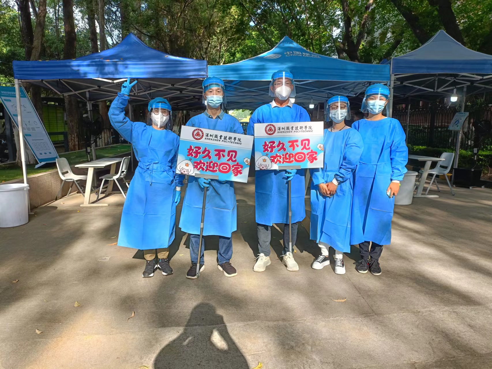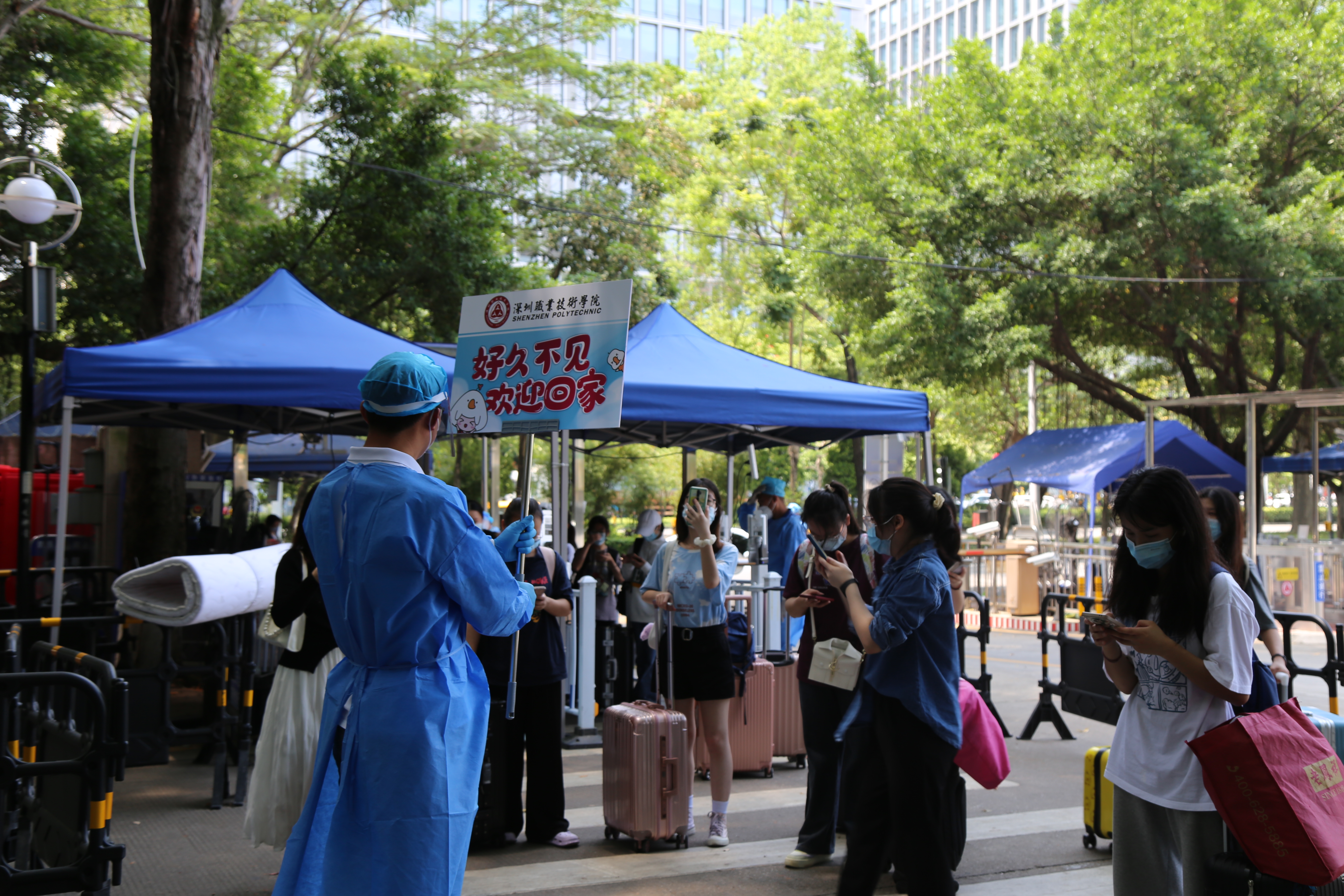 “好久不见,欢迎回家!”一位位举着彩色欢迎手牌的老师站在校内,热情地迎接返校的学生。学校专门准备了深职院专属口罩,深受学生喜爱。在老师们的引导下,返校学生扫码登记信息,间隔排队,并完成核酸检测,辅导员在博达书院迎接回宿舍的学生们,并暖心地准备了防疫物资,中午统一发放盒饭,确保疫情防控工作落在实处。
